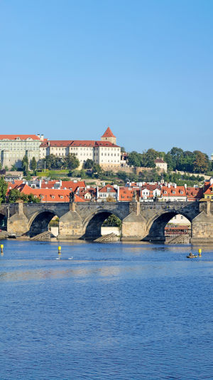 Le château domine la ville depuis une colline, et est visible depuis de nombreux points de Prague.