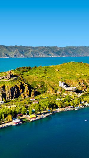 Avec ses 1 360 km², le lac Sevan figure parmi les plus grandes étendues d’eau intérieures d’Eurasie, et l’une des plus élevées. Entouré de crêtes volcaniques et de collines parsemées de pins, son rivage offre une diversité de paysages — des plages de galets aux anses herbeuses. Accessible toute l’année, la meilleure période s’étend de mai à septembre, lorsque l’eau atteint 18–20 °C et que les sentiers de montagne s’habillent de fleurs sauvages.