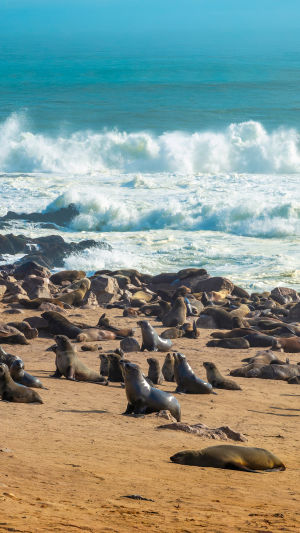 Ce site protégé abrite plus de 100 000 phoques du Cap toute l’année, avec un pic en octobre lorsque les mâles dominants marquent leur territoire. De novembre à décembre, entre 30 000 et 40 000 petits naissent, s’ébattant sur le sable, leurs pelages sombres contrastant vivement avec les dunes claires.