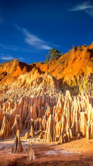 Dans les fentes étroites et sur les corniches baignées de soleil, la vie prospère. Des lémuriens sifakas blancs — fourrure immaculée et visage sombre — bondissent avec grâce entre les branches fines. Des lémuriens à queue annelée se prélassent sur des rochers réchauffés par le soleil. De vieux baobabs, ébènes et tamariniers s’insinuent dans les fissures de pierre, leurs racines agrippant le calcaire comme des mains noueuses. Écoutez attentivement : des gouttes d’eau résonnent au loin dans des grottes cachées.