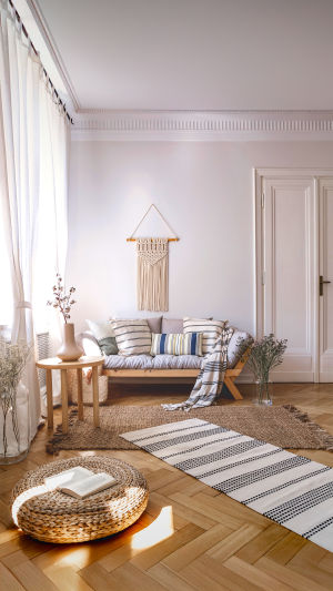 • Bohème : Pour un esprit libre et éclectique, choisis des tapis aux motifs colorés, irréguliers ou tissés à la main. Les matières naturelles comme le jute ou le sisal renforcent ce style bohème.