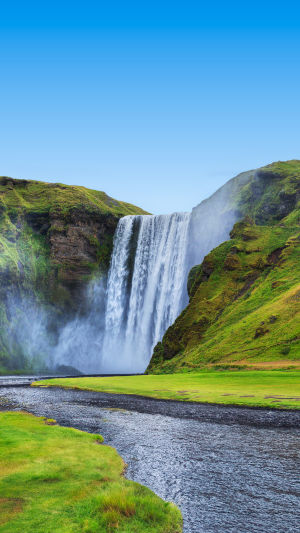 Skógafoss se situe dans le sud de l’Islande, près du petit village de Skógar. Elle se dresse le long de la rivière Skógá, là où l’eau plonge soudainement d’une haute falaise. Cette falaise marquait autrefois la côte ancienne de l’Islande, ce qui explique la chute si droite et spectaculaire. Aujourd’hui, la cascade se trouve tout près de la route circulaire principale (la Route 1), ce qui la rend très accessible aux voyageurs traversant le pays en voiture .
