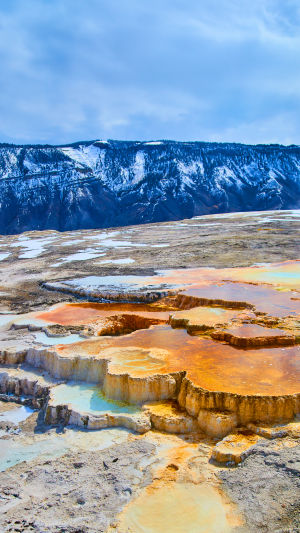 Mammoth Hot Springs est un paysage vivant, en constante évolution. Les terrasses grandissent, s’assèchent, se déplacent et se reforment au fil du temps. Associées aux montagnes enneigées, elles donnent l’impression que la nature sculpte lentement une œuvre monumentale et dynamique.