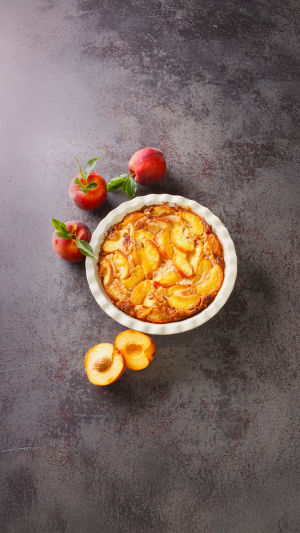 Beurrez légèrement le fond et les côtés d’un moule à tarte ou d’un plat à gratin. Une fois la préparation aux pêches prête, étalez-la uniformément au fond du moule.