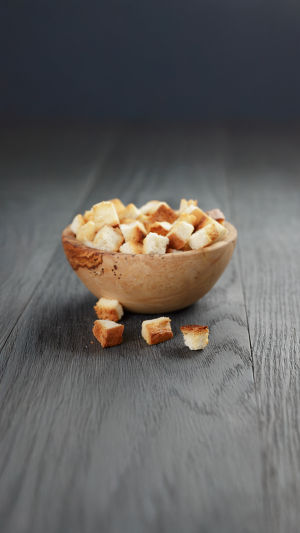 Placez les dés de pain dans le bol en bois.