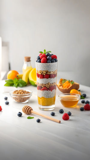 • Dans un verre ou un bol, alternez couches de yaourt grec nature, une cuillère de graines de chia, des baies fraîches et un peu de flocons d’avoine.