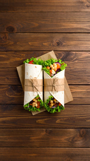 <b>Déjeuner :</b> Wrap aux pois chiches, concombre, tomate et houmous, dans une tortilla complète.